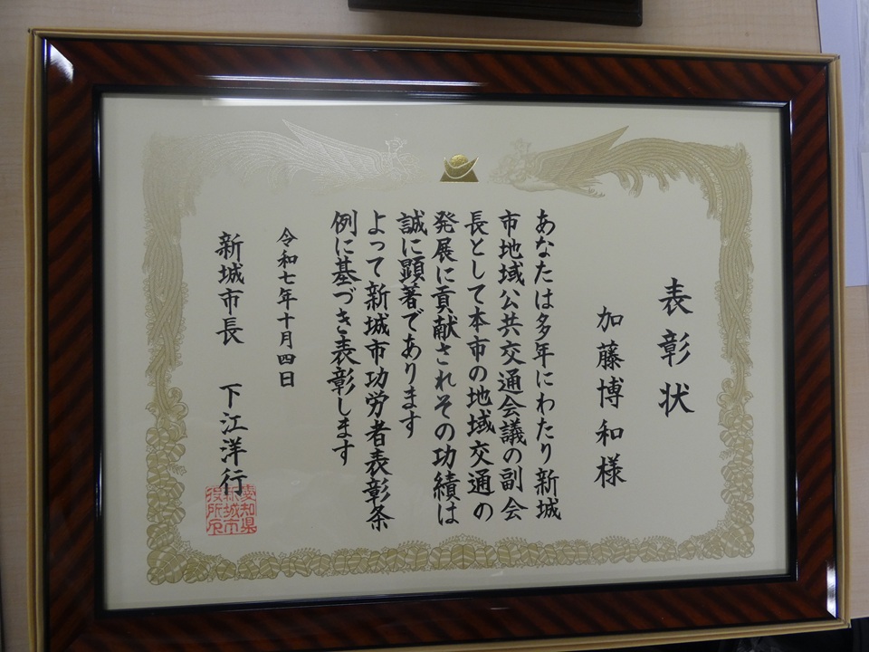 - 新城市の地域公共交通政策には2005年の合併前からかかわっており、学校閉校への対応。合併後の全域での一体化に向けた調整、各地区の実情に応じた見直しとそのための住民との話し合い、基幹的なバス路線の利用者減少や、市内最大のタクシー事業者の廃業といった危機への対応、名古屋藤が丘への高速バスの運行など、様々な取組を行ってきた。その努力が合併20年の記念式典での表彰となり、感慨深い。言うまでもなく市の様々な方々の努力でできたことであって、私はそれを助けたに過ぎないが、皆さんの代表としていただいたと思っている。